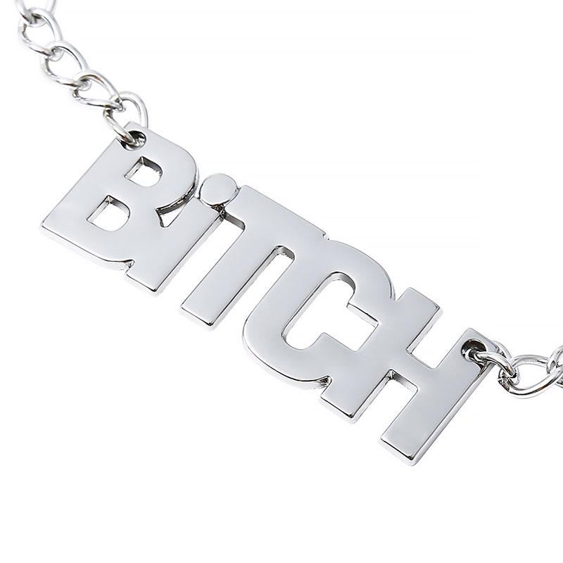 Par de grampos para mamilos com regulagem, possui corrente que interliga os dois grampos com pingente escrito BITCH.
